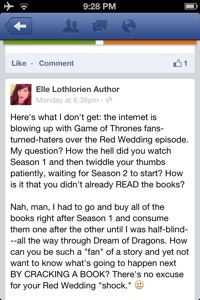 As for the ridiculousness of myriad viewers’ outrage at HBO? I really couldn’t say it any better than one of my favorite indie writers (Elle Lothlorien) did the other day on Facebook: